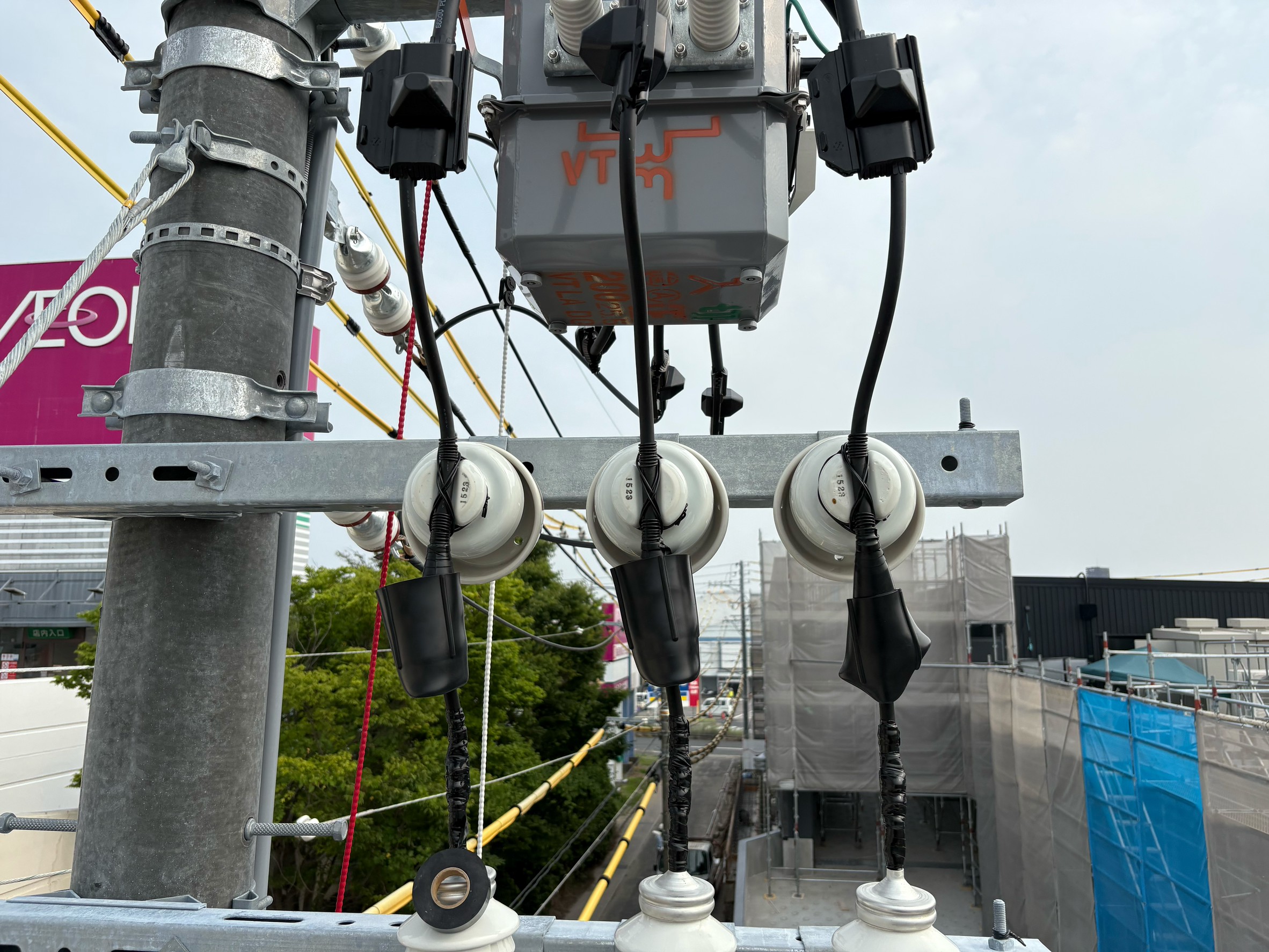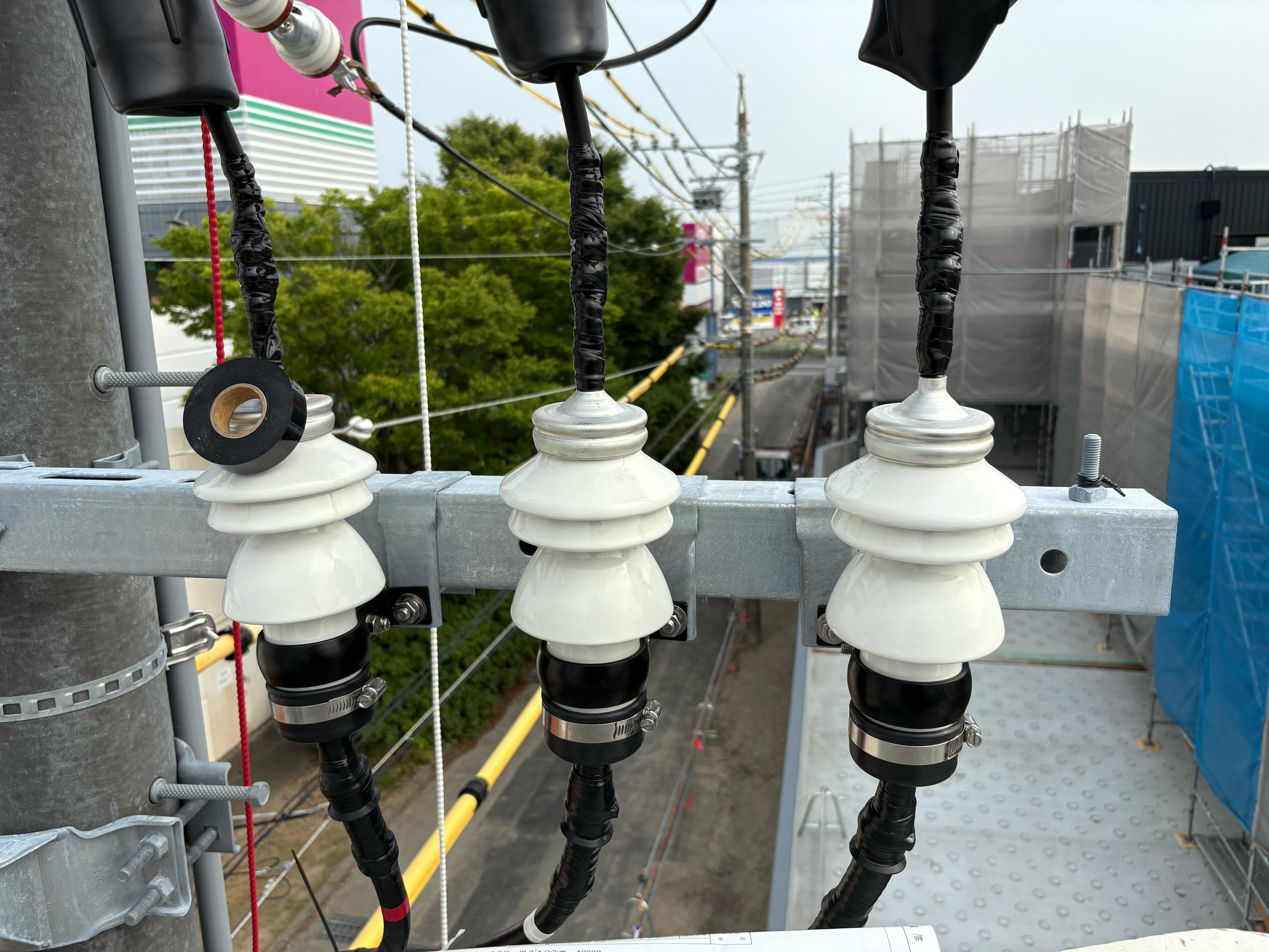 この工事は、高圧配電線(通常6,600Vまたは3,300V)を電柱上で適切に終端処理する作業で、次のような流れで行います。